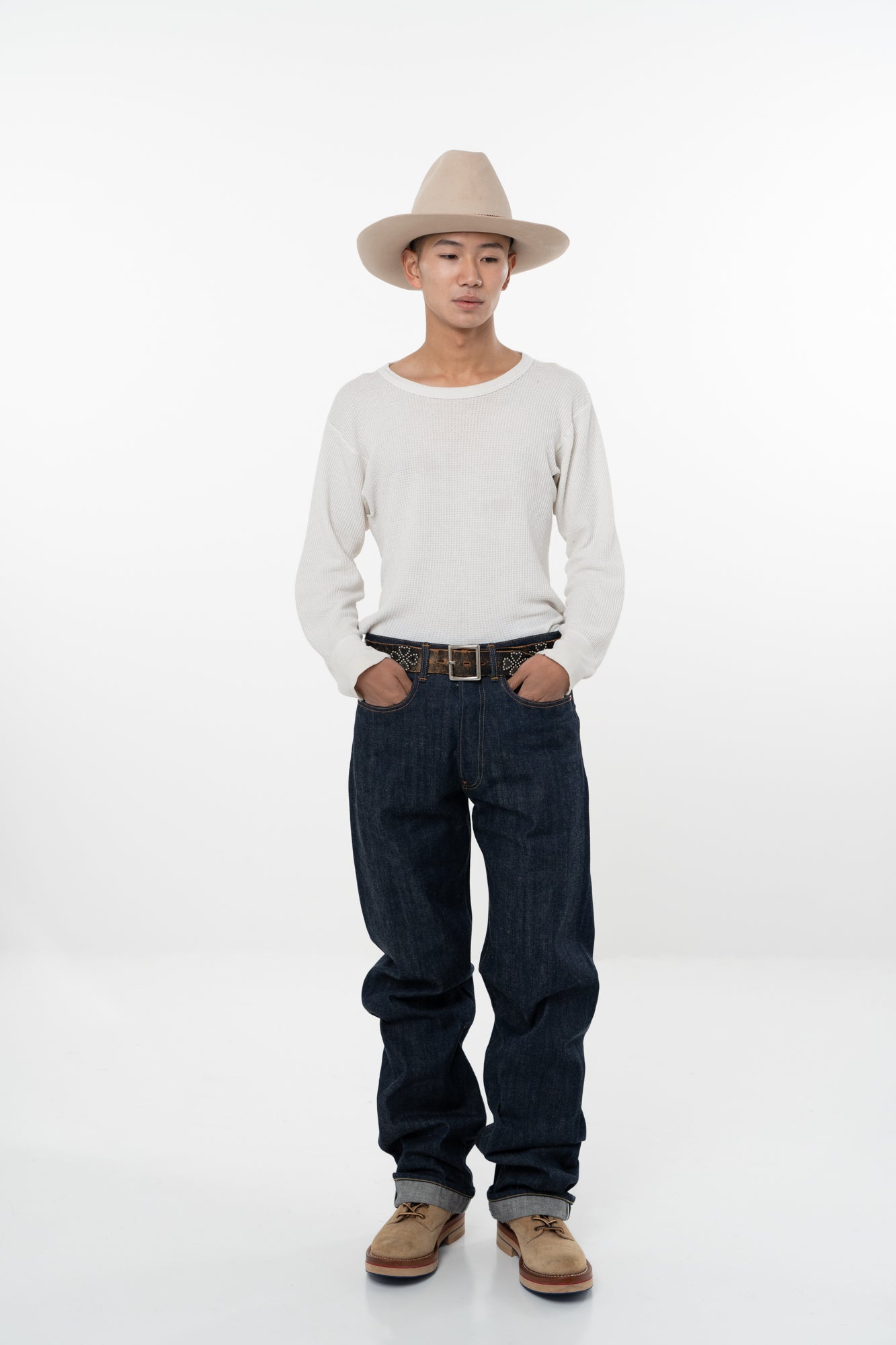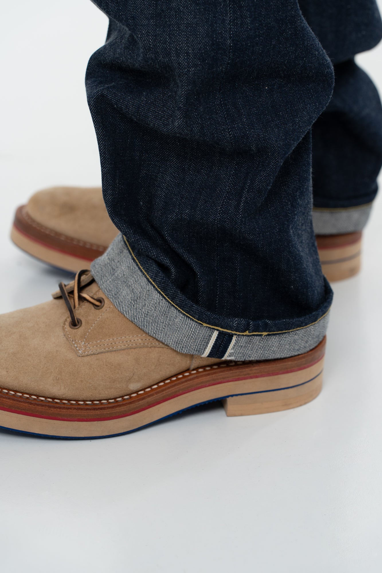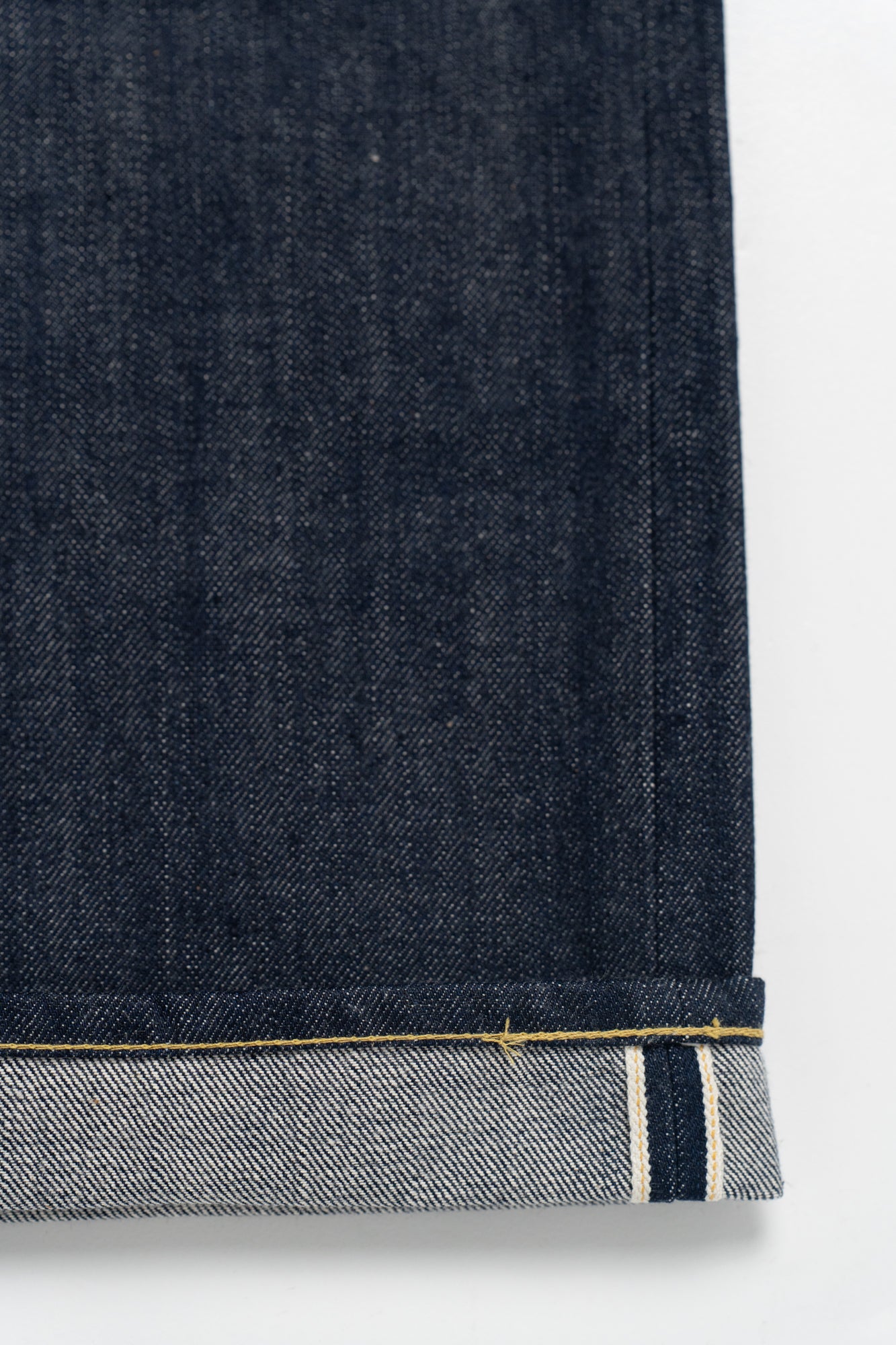 デニム生地は糸番手 7/1x7/1 12,56oz 縦糸,横糸 自然な感じのムラ糸を使用し、縦糸染め、インド藍の本藍100% ロープ染色を施しています。旧式のシャトル織り機を使用し、テンションを少なくゆっくりと織り上げ、糸の膨らみをそのまま生地にいかしている。最後に水を使わず、防縮加工だけで仕上げ、生機みたいな風合い、見え方が特徴で、現代のセルビッチデニムより、より古さを感じさせるデニムに仕上げています。