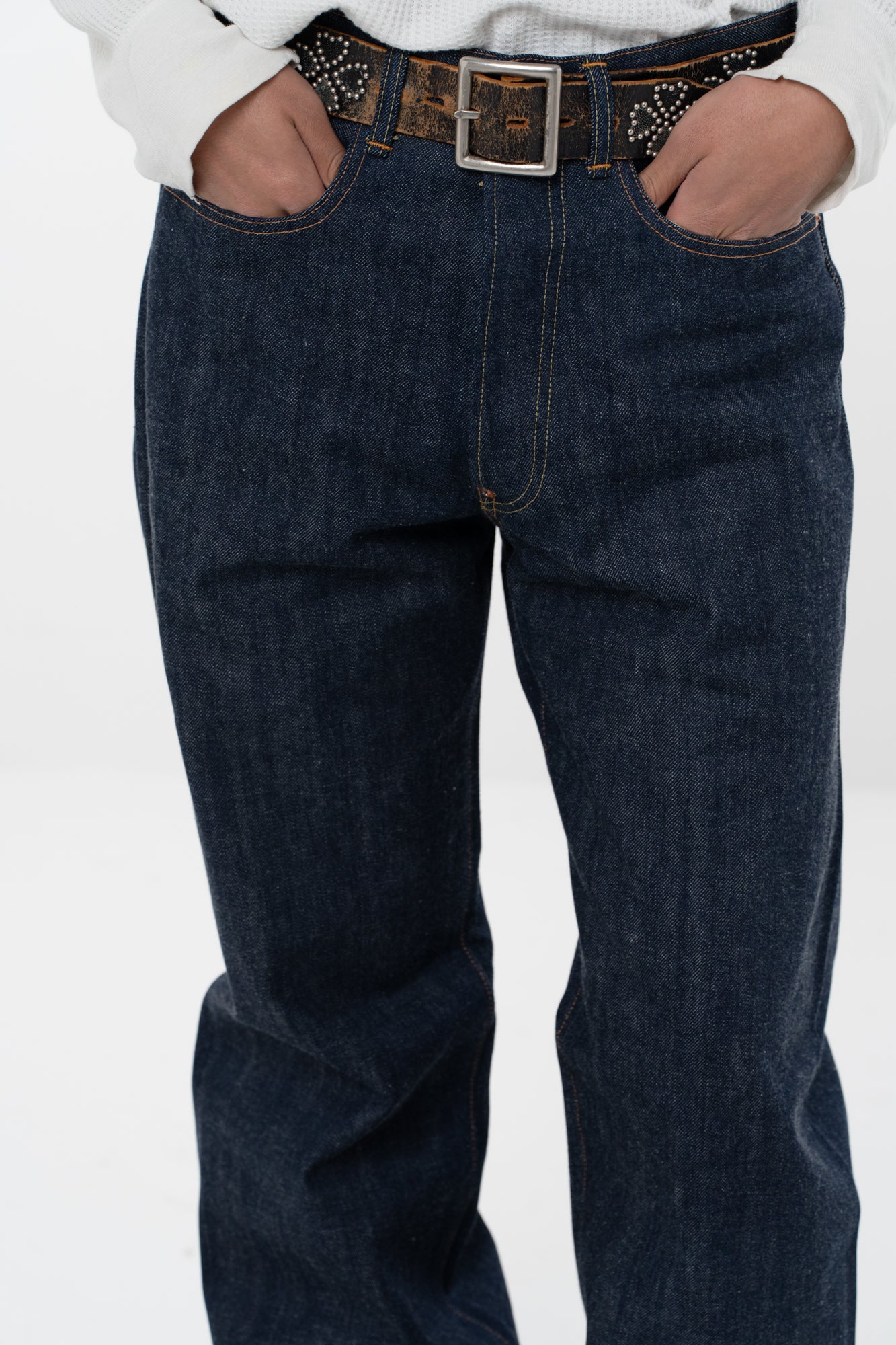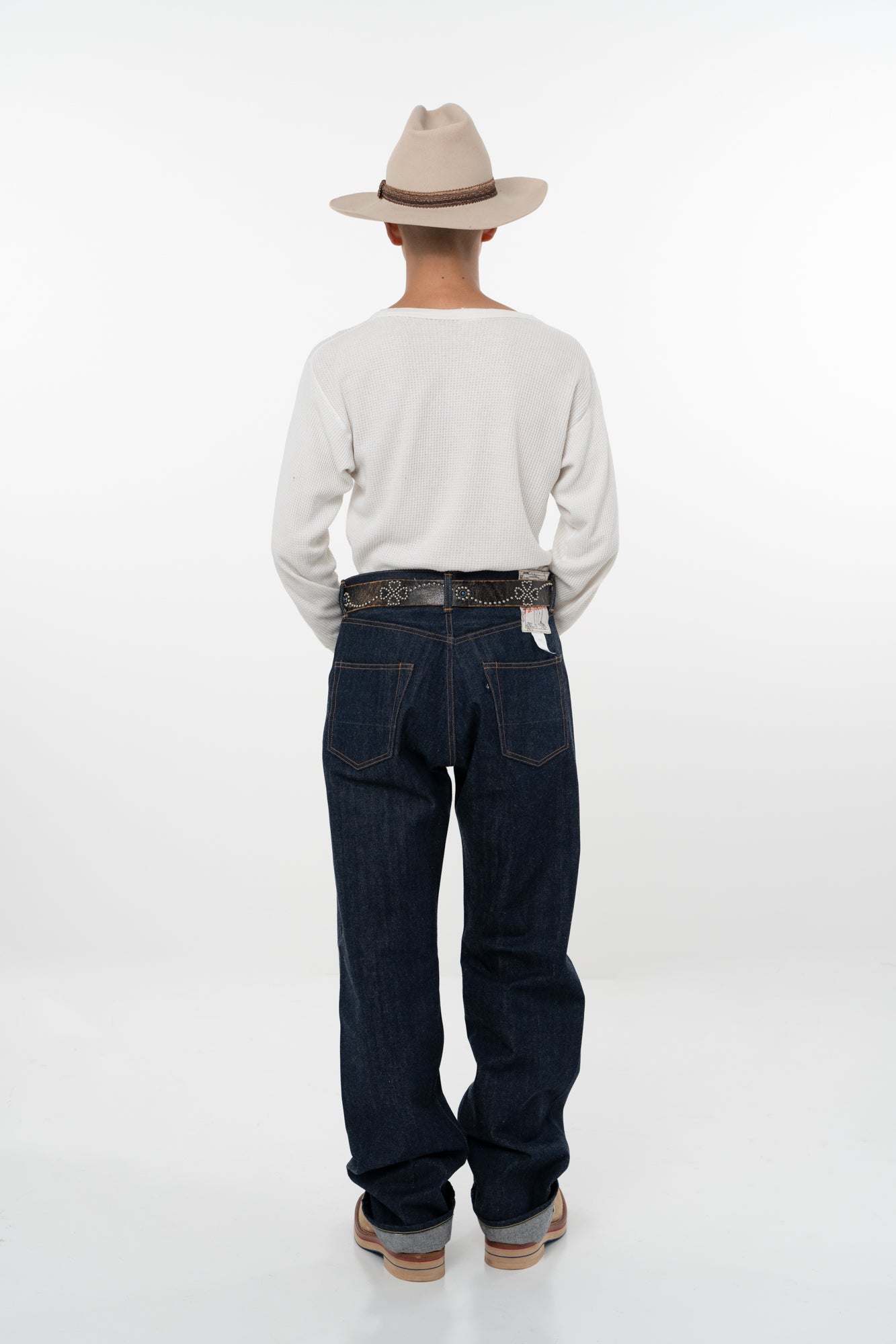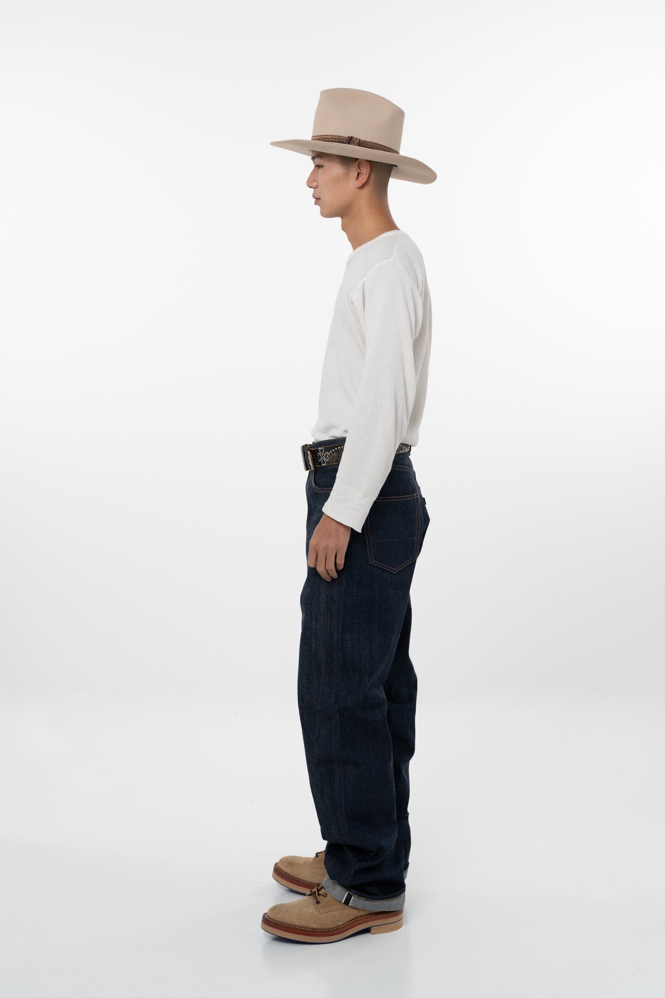 ルーズフィット、股上深め、太めパイプドステムの40sを意識したシルエットで、フロント明きボタンフライで明き止まりにリベット打ち、バックポケットの隠しリベット&バータックやベルト(下前側)のVステッチ、内股コバステッチ、裾チェーンステッチ等々 ヴィンテージ仕様です。サイドステッチも40sを踏襲し、長めにしてあります。